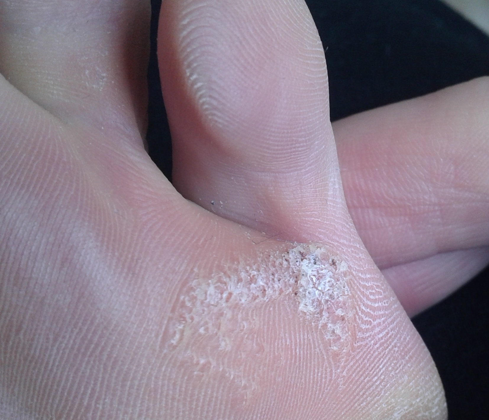 Začalo sa to tvoriť pred vyše mesiacom, pod malíčkom. Najprv na tom mieste začala tvrdnúť koža (klasické tvrdšie miesto, na ktoré sa dostupuje), ale potom sa v tom začali tvoriť tie "jamky".