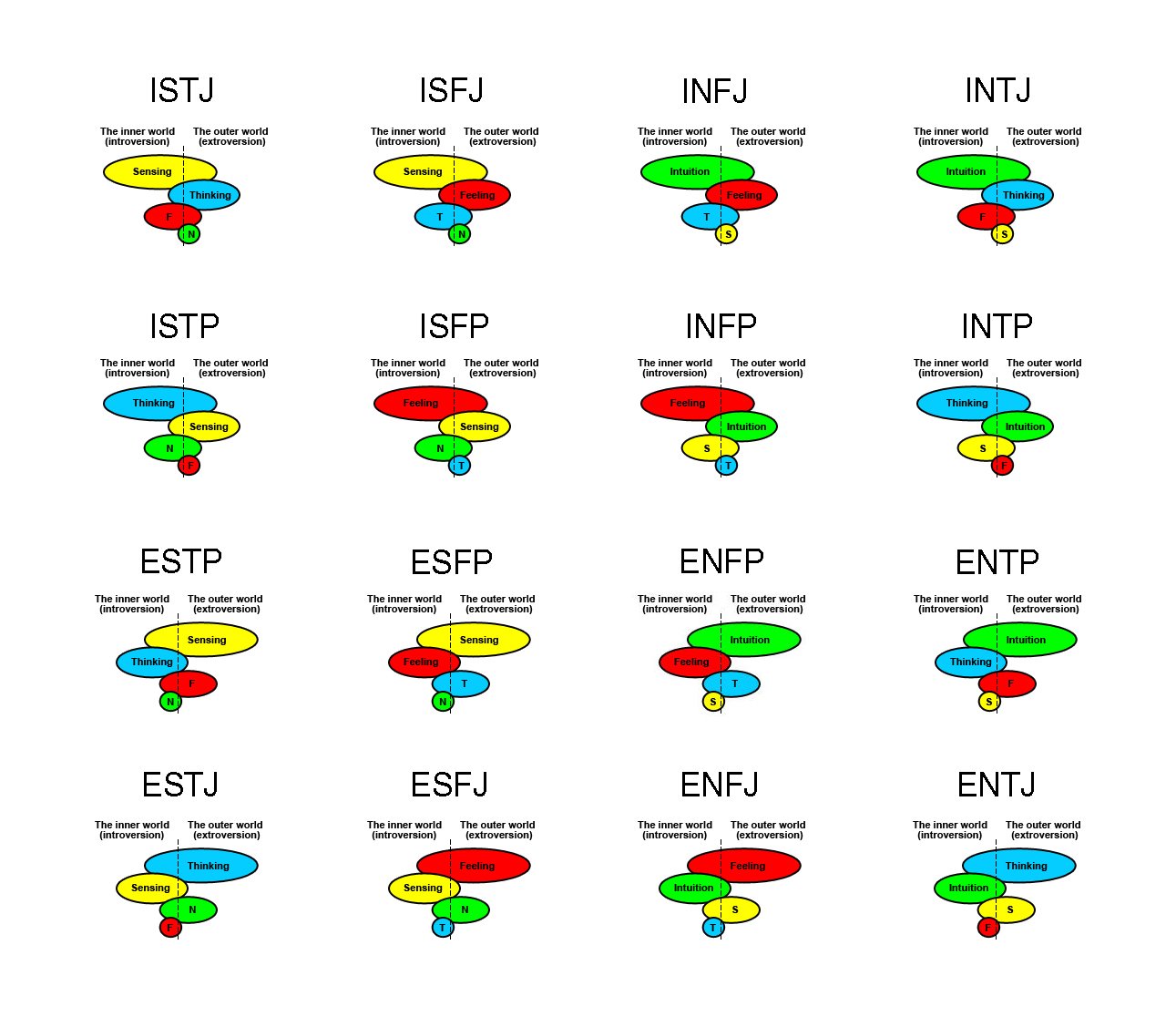Pozri si prilozeny obrazok, ten najjednoduchsie znazornuje preferencie kazdeho typu. Rozoznavame 8 kognitivnych funkcii, ktore sa delia podla toho, ci su percepcne (intuicia/senzoricke vnimanie), alebo hodnotiace (myslenie/citenie), introvertne, alebo extrovertne. Kazda jedna funkcia ma svoje charakteristicke vlastnosti.