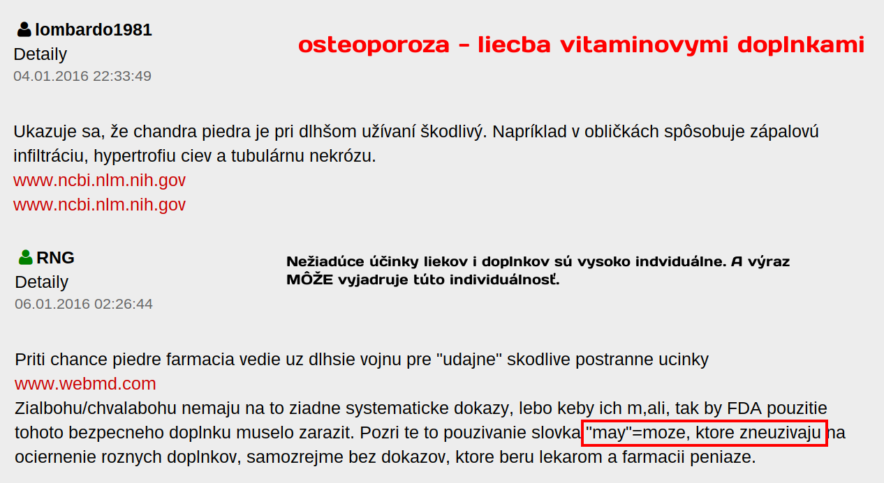 Je na kazdom z nas, ci dame na rady tohto pana alebo nie (niekomu mohli jeho rady pomoct, niekomu nie). Kazdy ma pravo sam sa rozhodnut a zvazit ci brat farmaceutika alebo skusit vit, doplnky. Tak ako sa mylia lekari, moze sa mylit aj pan RNG aj my vsetci. Nikto nie je neomylny a dokonaly. Preto, prosim, neutocte a neobvinujte nikoho a radsej pridavajte vase skusenosti s osteoporozou. Dakujem. Lucka